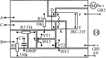 通常利用水塔向用户自来水龙头供水,而水塔则需要利用水泵向贮水箱不断补充水,水多了会溢出,少了供水又会中断,这就需要水位自动控制装置。 小水塔水位自动控制电路 见图13。它由水位传感电极、控制电路、电动机(小离心水泵用)和电源等组成。控制电路由VT1、VT2和继电器K等组成。当水箱缺水时,水面低于B点,水位传感电极A—B、B—C之间由于没有被水淹没而开路,VT1、VT2截止,继电器呈释放状态,继电器衔铁F与常闭触点D接触,接通水泵电源GB2,小离心水泵电动机启动,向贮水箱供水。当水位上升至A点,水位传感电极A—B之间被水淹没,产生偏置电流使得VT1、VT2导通,继电器吸合,常闭触点断开,小离心水泵停止供水。此时,继电器衔铁F与常开触点E相触,电源通过继电器接通的常开触点F-E以及C—B之间能微弱导电的水,继续产生维持VT1、VT2导通所需的偏置电流,继电器吸合。自控电路直到水位降至B点以下时,C—B之间开路,VT1、VT2截止,继电器释放,常闭触点接通,小离心水泵开始供水。如此周而复始,完成水位自动控制作用。
